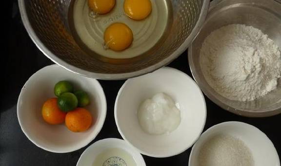 主料:低筋面粉90克,凝固型酸奶50克,蛋4个,金桔3个,小青柠3个,茶油15克