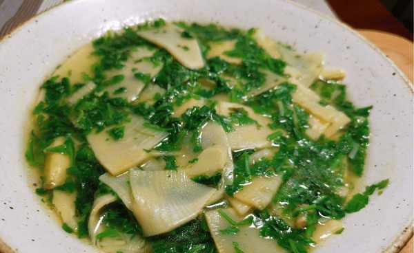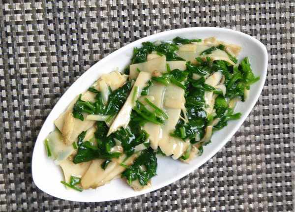 准备一些食材:选择冬笋250克左右(建议选择新鲜的笋子,捏的时候比较小,比较软),野荠菜150克左右(要看荠菜的根和叶))叶子应该非常鲜亮和绿色,根部不应发霉也不会变质),少许水、少许盐、少许鸡汤、少许酱油、少许胡椒粉等等。