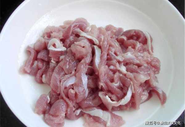 第二步:将瘦肉用清水洗净,将瘦肉切成数块,再切成薄片,将剁碎的瘦肉放入碗中,分别加入料酒、生抽和生粉少许。右手轻敲几下,煎瘦肉末前,抹少许色拉油保湿滋润备用。