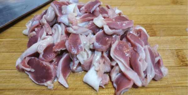 4:鸡肚切块,锅里放少许冷水,加入几片姜片,白酒,料酒,将鸡肚煮3-5分钟,用冷水洗净,控湿鸡肚。