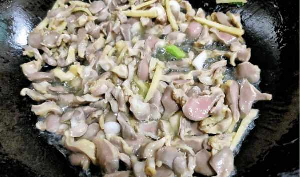 6:置旺火炸熟,倒入焯过水的鸡肚,鸡肚翻炒一分钟左右,加点泡椒和几片大蒜快速炒熟。