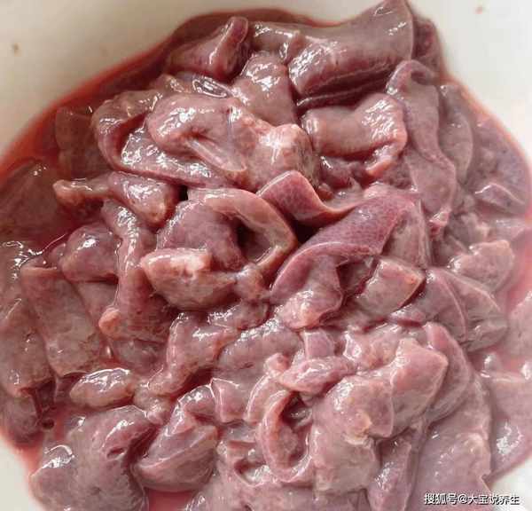 第二步:猪肝一片用清水冲洗干净,去除粘稠物,猪肝逆纹切成薄片,将猪肝片放入容器中,用冷水浸泡片刻,洗净血水猪肝片去水,换几次水,把猪肝片洗干净,检查猪肝的水分。
