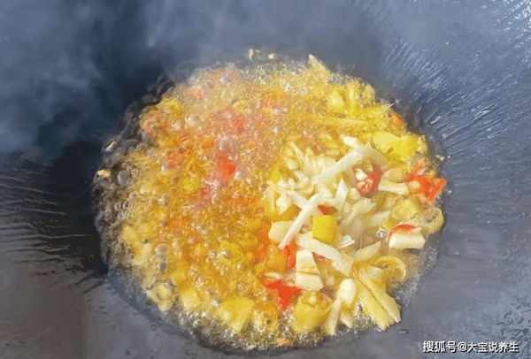 第八步:加入少许泡椒、葱丝、姜丝,快速翻炒至葱香味出来,倒入炸好的猪肝翻炒入味。
