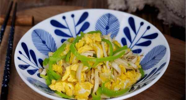 第六步:加入一些辣椒丝调色,最后加入金黄的鸡蛋,稍微翻炒一下,让杏鲍菇、辣椒丝和鸡蛋一起翻炒入味。第七步:最后撒上盐和糖,加少许胡椒粉,拌入少许香油,装盘。细嫩营养不低。