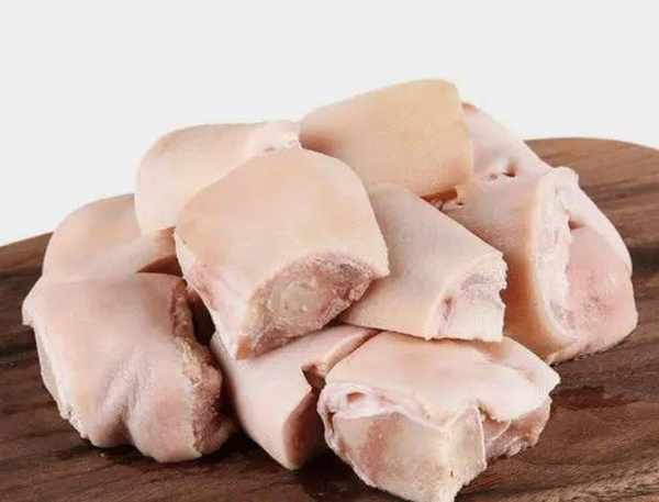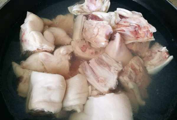 1:准备一些材料,两只猪蹄去毛,猪蹄切成小块。猪蹄本身有腥味,所以要先用冷水浸泡,洗掉身上的血水和表面的血水。