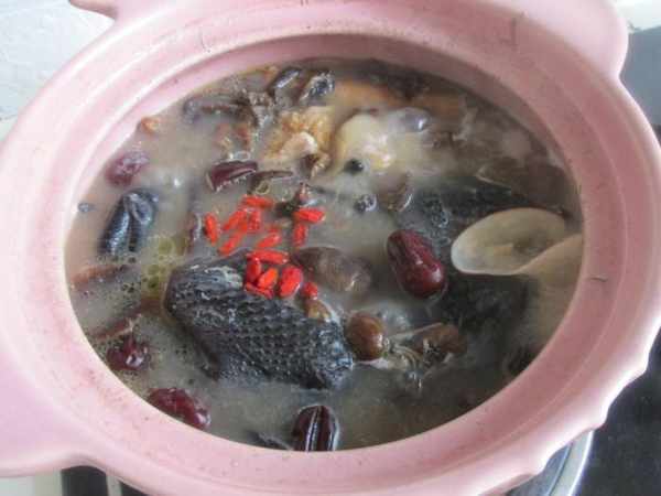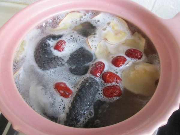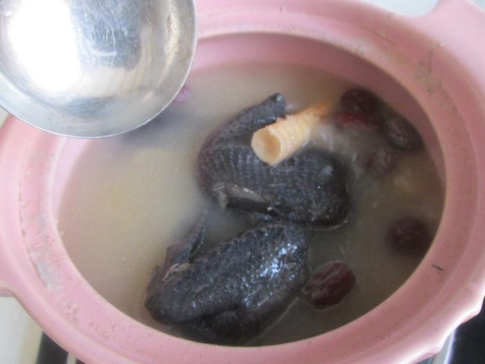 把砂鍋中加入適量的水,放入烏雞,花膠,鯊魚骨,海底椰,紅棗,薑大火燒開,改成小火慢慢的燉上大約40分鐘。