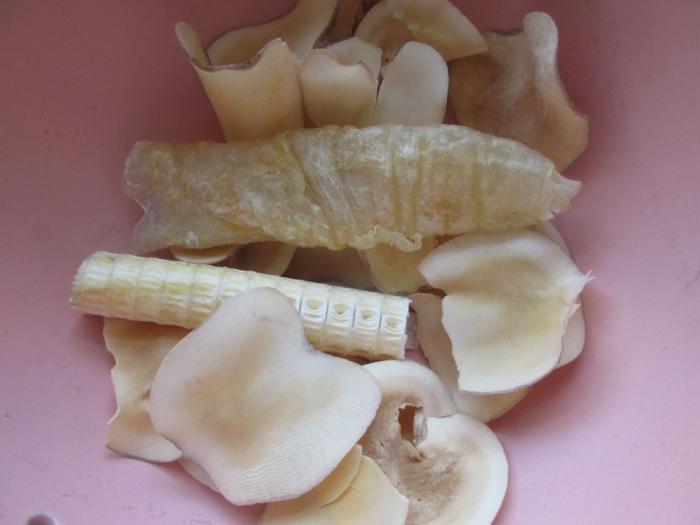 海底椰和花膠,鯊魚骨清洗備用。海底椰就是海椰子,海底椰含有維他命和礦物質以及胺基酸,可以強壯身體、益氣美容等。經常做湯的時候放上一些,可以讓肌膚潤澤,還可以去火解暑熱,海底椰裡面含有豐富的維他命E能保持女性青春活力,豐富的鋅可促進少女發育,而其中的鎂可改善老年人的循環系統。所以海底椰是做湯配料中不錯的一種食材。而鯊魚骨和花膠對於女生更是好處多多。