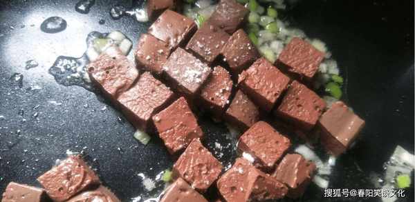 第三步:锅中加入几滴食用油,放入姜蒜爆炒片刻,加入鸭血块,再撒上盐不断翻炒,再加水,大火将鸭血煮熟。