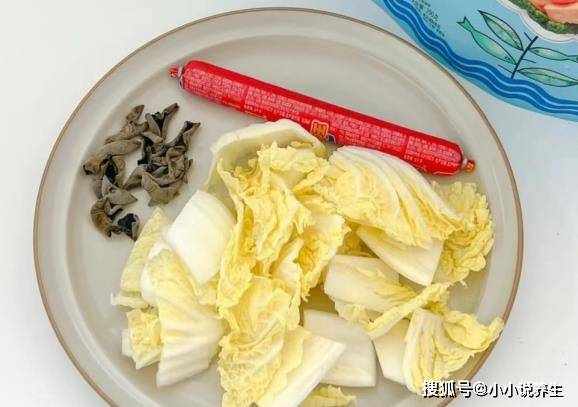 第三:火腿肠去掉外包装,切成几片,香葱和大蒜切成薄片,娃娃菜切根,叶子反复洗净,切成几小块。