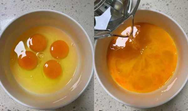 第四步:将4个散养鸡蛋打入一个空碗中,用筷子搅打出蛋液,加少许水拌匀,用滤网去除一层气泡,加入白醋去腥,加盐等调味料。