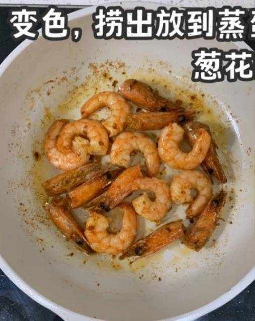 第六步:把炸好的虾放在鸡蛋上面,加少许生抽,撒上一些葱花再蒸五分钟。