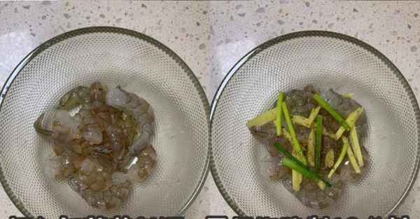 第二步:将虾放入容器中,加入少许料酒和生抽,加入少许姜末和葱花,加入半勺料酒,加入盐和胡椒粉,快速抓拌均匀,在冰箱里腌20分钟左右。