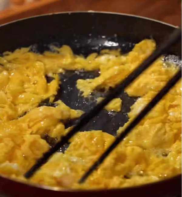 第四步:煎锅预热片刻,中火在锅中煎蛋液,让蛋液慢慢凝固,用锅铲将蛋液煎熟,关火,放入空容器中。盘子。