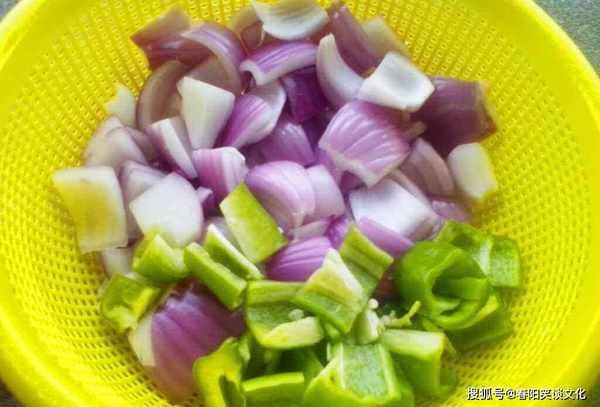 第二步:洋葱去根,反复洗净切成小方块,青椒压在茎上,青椒全部切成小块,蒜切碎。