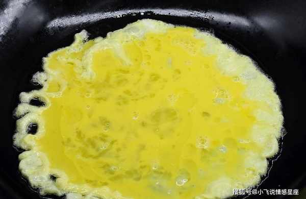 第四步:锅中加入食用油,油热后加入蛋液,待蛋液升温后转中火煎蛋液,然后回锅继续煎。
