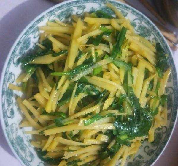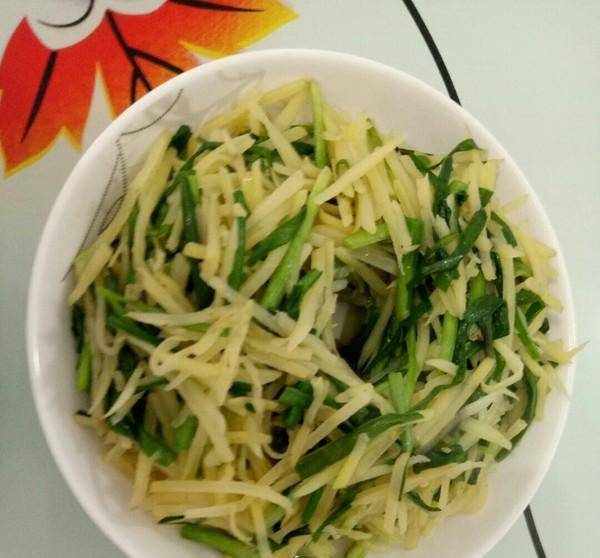 Tips:土豆其实是一种高淀粉的食材。想要土豆泥非常酥脆,一定要将土豆泥泡在冷水里。大蒜,和土豆条一起翻炒,最后加入韭菜,待两种食材入味后,撒上盐和胡椒粉,最后加少许醋,搅拌均匀。