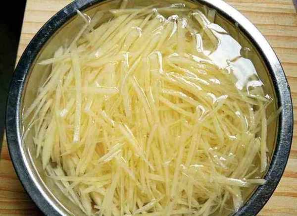 第二步:将一些土豆丝放入容器中,加水没过土豆丝,浸泡几分钟,用手洗净,沥干水分备用。