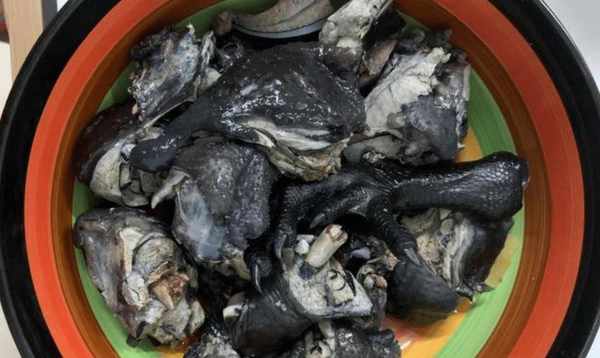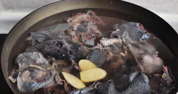第一步:将买来的乌鸡剖开腹部,将乌鸡的内脏取出,将肠和肺清洗干净。一定要多洗几次,然后用刀把乌骨鸡剁成小块,把乌骨鸡的头尾去掉。