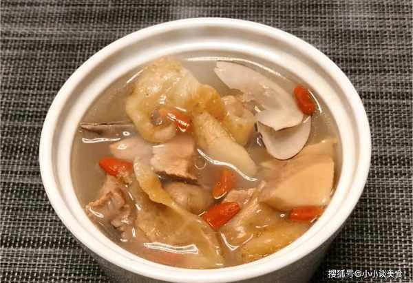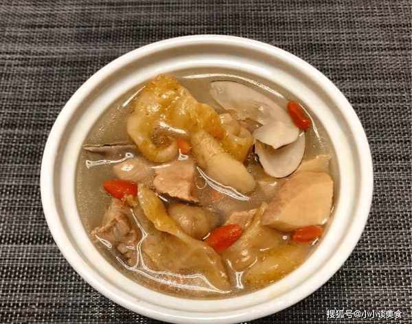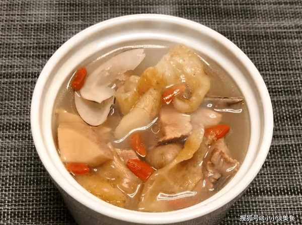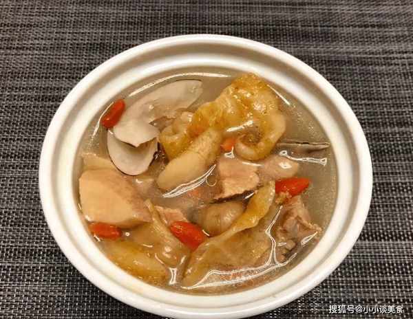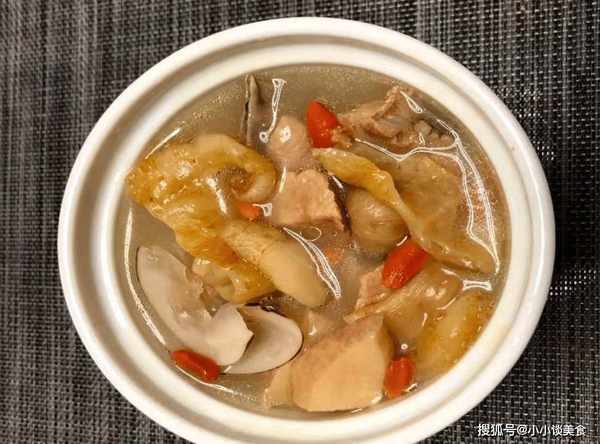 第七步:最后加入泡好的鱼胶,小火炖20分钟左右。出锅前加入枸杞子慢炖至汤汁入味。
