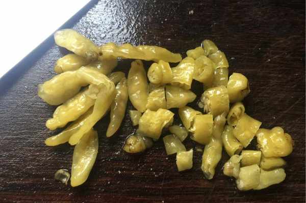 第四步:辣椒洗净切段,青辣椒去蒂切小方块,黑蘑菇18克热水洗净,泡发的蘑菇用热水煮(碱和食盐各加),去掉黑菇多余的部分备用。
