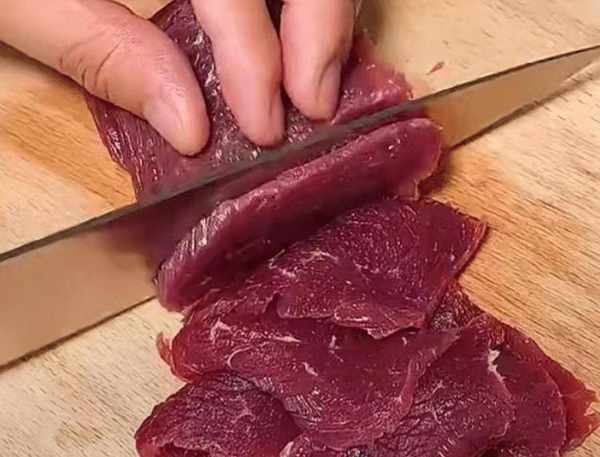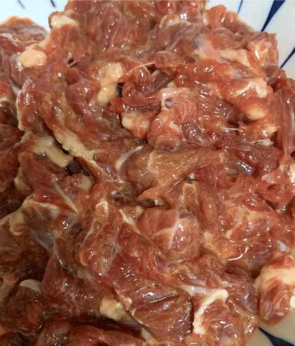 第二步:清水可以洗掉表面的血水,将牛肉切成几薄片,将牛肉连着肉切条,准备好腌制好的牛肉。