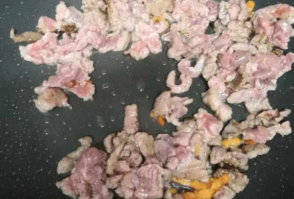 第五步:大蒜和姜分别切好,锅底烧热,放入腌制好的牛肉,用大火快速煎熟牛肉,待牛肉变白。