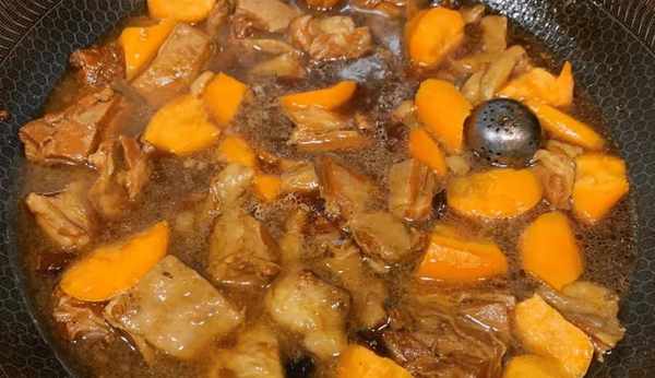 第八步:大火烧开后转小火炖40分钟,加入胡萝卜继续小火,将胡萝卜小火炖至软烂,加入适量的盐和糖炒匀.一会儿。