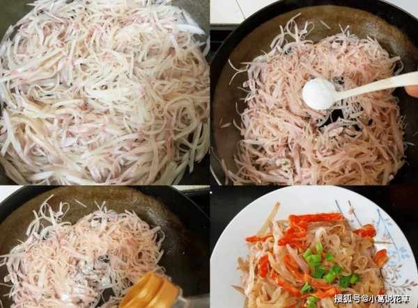 第二步:樱桃萝卜去壳,萝卜洗净切丝,萝卜丝用清水泡软,加少许盐检查水分,再炒萝卜。
