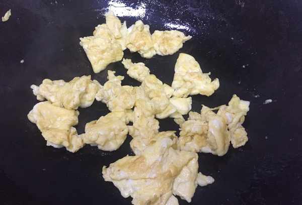 第五步:另取一个平底锅加入食用油,然后加入蒜头炒香,加入菠菜炒去水分,加入煎好的鸡蛋块。
