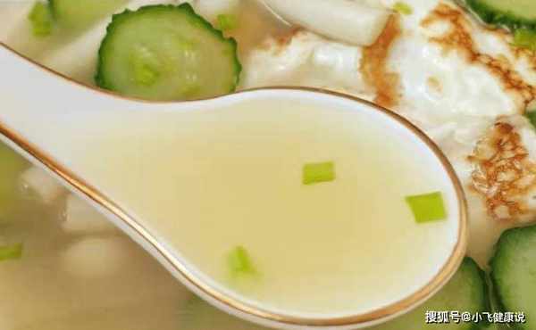 小贴士:黄瓜白玉菇煎蛋汤是一道很便宜的素汤。必须正确选择几种成分。白玉菇要用盐水浸泡、洗净。黄瓜应洗净切片。可以撒少许盐,防止鸡蛋容易粘锅。这道汤最好用高汤,加入荷包蛋、白蘑菇和黄瓜,用中小火煮,佐以香料和小葱,出锅即成。