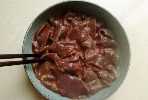 第三步:将买回来的猪肝放入容器中,加少许水浸泡,一大碗脏水泡完,然后调水,将猪肝部分切成薄片,去脉去血船只。猪肝有很多血水,用流水冲洗一下。