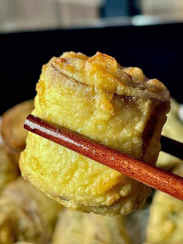 ③调制一个面糊,用卷好的茄子裹上面糊,油热放入炸至金黄捞出即可。