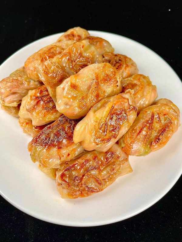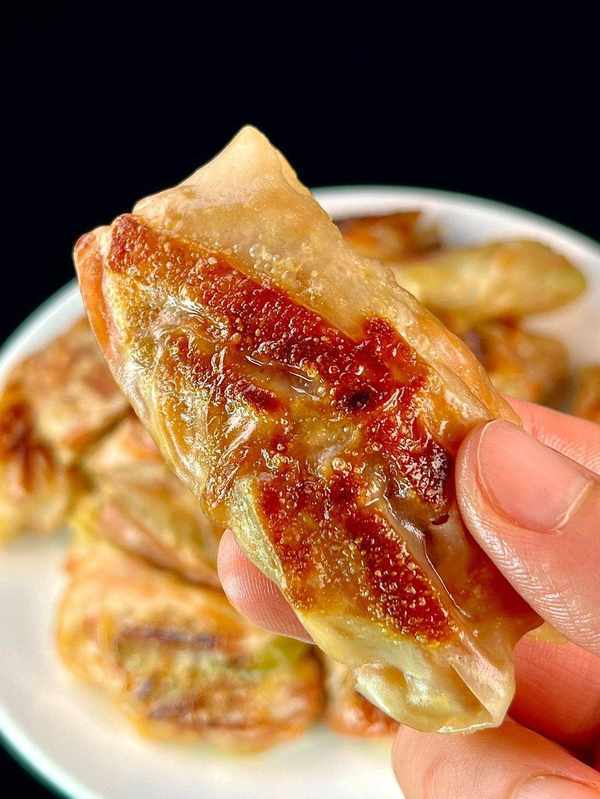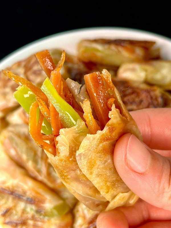 3、饺子皮用擀面杖擀大擀薄,放入炒好的蔬菜丝,包起来,油热放入包好的卷饼,煎至两面金黄即可。