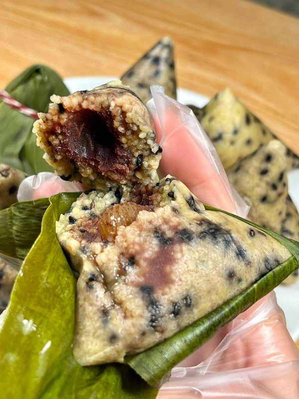 主要材料:粽叶,红豆沙,小米,黑芝麻、蜜枣。