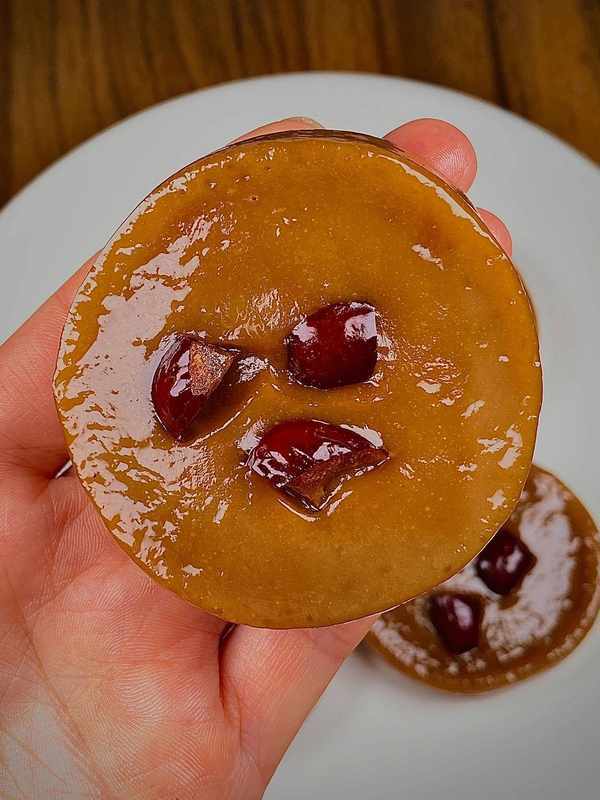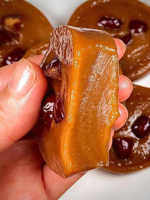 2、将红豆沙压扁放入蜜枣包起来作为馅料备用。