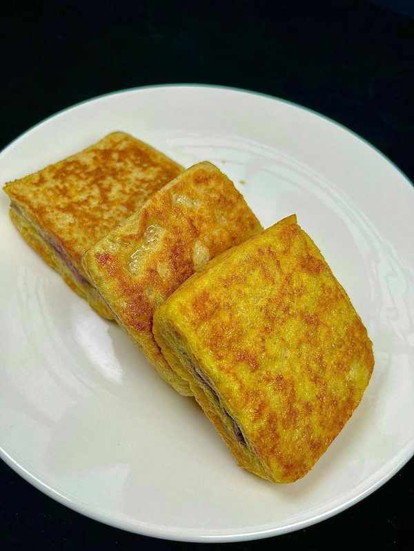 3、鸡蛋取出蛋黄,搅拌成蛋液,将吐司两面裹上蛋液,油热放入锅中小火慢煎,煎至两面金黄即可。