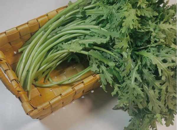 第二步:锅中放适量的水,将菊花倒入焯水,加入盐和油,焯水约5分钟。15秒,取出并沥干。