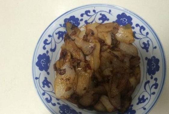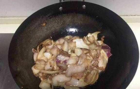 接着就是把五花肉焯水后切成片,然后就把五花肉放在锅里面开大火炒出油,油出的差不多的时候就把五花肉捞出来,然后再把洋葱倒进去翻炒一下,接着就是加适量的盐翻炒均匀,洋葱变软了之后在把肉片倒进去翻炒。