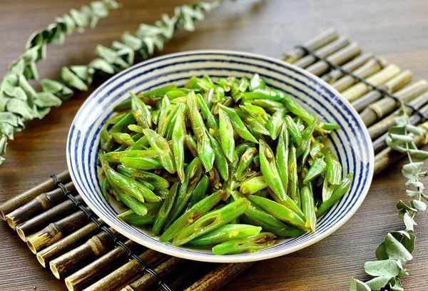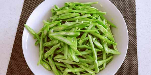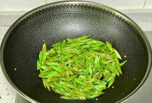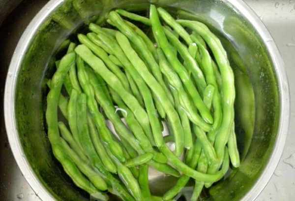 1:将绿豆用清水洗净,将绿豆的老茎撕掉。四季豆要想保持翠绿的颜色,需要烧开一小锅热水,加入少许盐和植物油,让四季豆稍微煮沸,取出切成几根细丝。