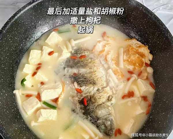 第七步:煮15分钟左右,撒上一茶匙盐,半茶匙胡椒粉,半茶匙鸡精,撒上几颗枸杞,继续煮几分钟,撒上葱花,转动。熄火,取出蘑菇盘。豆腐汤就做好了。