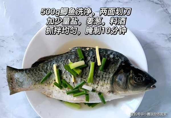 第一步:将一些食材都放在案板旁边,一条活鲫鱼去掉内脏和鱼鳃,记得刮掉肚子的黑膜,鲫鱼背部划一些口子,表面涂抹一些食盐,调入料酒去腥,加上一些葱段,将鲫鱼腌制10分钟左右。
