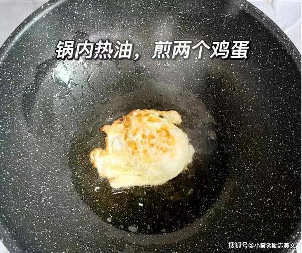 第四步:锅底烧热加上植物油,将两个鸡蛋磕在锅里,将鸡蛋两面煎至金黄,装在碗中备用。