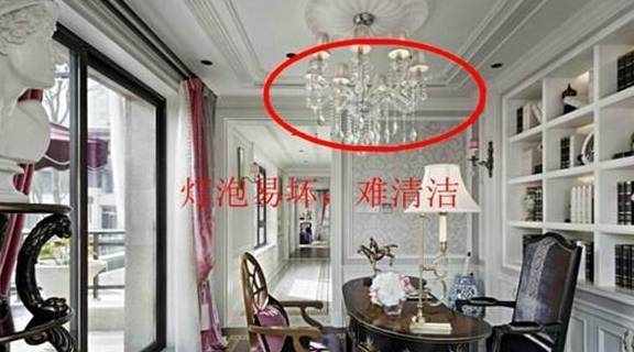 水晶灯就是个超难伺候的主,第一,超难打扫,N个灯泡,要一个个擦拭,累到哭。第二,超容易坏,动不动就有几个灯泡闹罢工,而且想要配到一样的灯泡还不太容易,最后等它灯泡坏光,只能报废了。