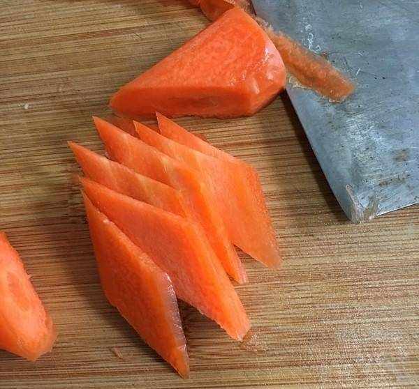 第二步:将胡萝卜两端切开,洗净切成菱形片,将胡萝卜放入热水中焯一下,捞出沥干。