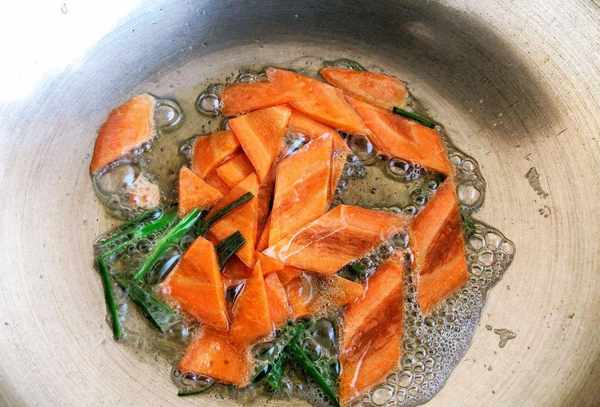 第六步:锅底继续加少许油,放入葱花炒香,加入胡萝卜片炒至断,放入香菇块翻炒片刻。
