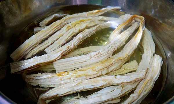 第三步:将干豆腐放入锅中,加入热水和盐,不要用冷水或热水,腐竹会慢慢膨胀,浸泡至变软,切成小块,煮一些热的。锅内加水,将豆腐竹稍烫一下,用冷水浸泡,捞出备用。
