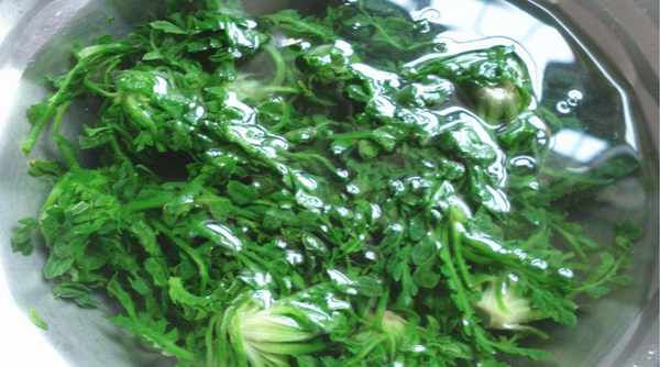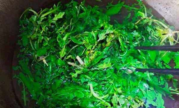 第一步:将野生荠菜的老茎和黄叶捏碎,将荠菜全部放入锅中,加入一大盘清水,将清水倒入荠菜中,加少许盐浸泡,捞出叶子上的灰尘和污垢,并洗至水变清为止。