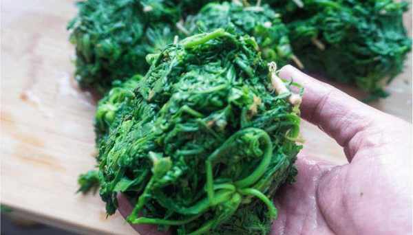 第二步:倒入清水,锅中烧开水,加入半勺盐,油烧开,将荠菜全部放入锅中,倒入荠菜炒至变软,加入盐。让荠菜更新鲜、更环保。第三步:水焯20秒左右,时间不要太长。取出水并让它冷却。将荠菜捏成一团,挤干表面的水分。
