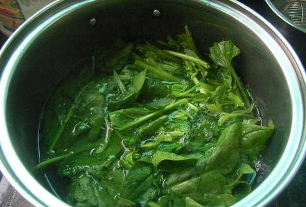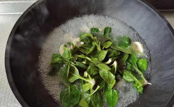 第五步:另起一锅水烧开,加盐烧开,下锅放入菠菜和香菇,加入菠菜去除叶子中的草酸,使叶子变软,香菇去除异味,控制两种蔬菜的水分含量.