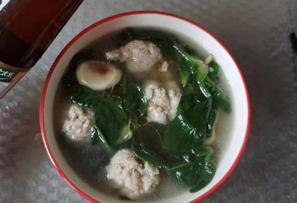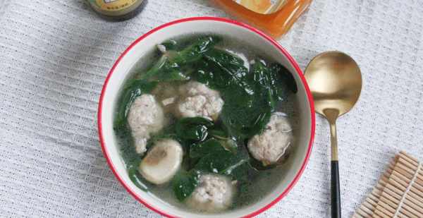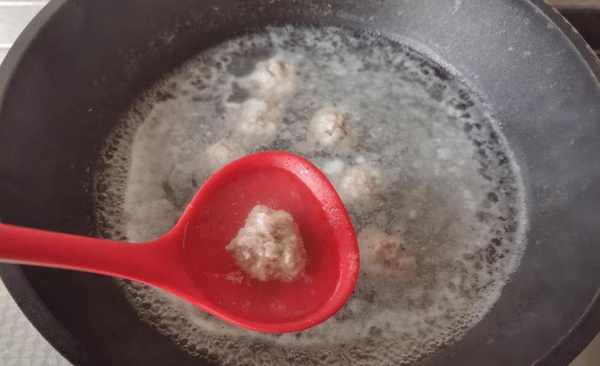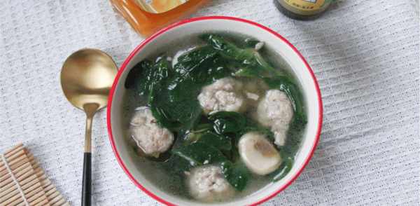 第六步:锅里装满水,加一勺肥肉,把汤烧开,用勺子把猪肉切成圆形,然后把水稍微烧开。将水烧开,放入每个碗中。等到猪肉煮熟,所有的肉都浮到上面。第七步:先将肉丸捞出,加入白蘑菇,加入切碎的菠菜,加入切碎的姜末,开火将汤烧开。
